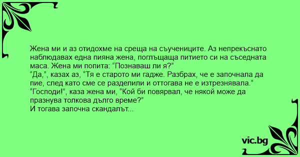 Жена ми и аз отидохме на среща на съучениците. Аз непрекъснато наблюдавах една пияна жена, поглъщаща питието си на съседната маса. Жена ми попита: “Познаваш ли я?”