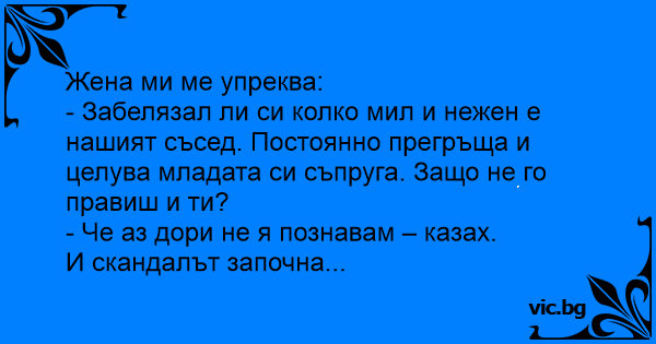 Los vecinos siguen enamorados Жена към съпруга си: За завтраком жена сердито пеняет своему мужу: Съпруга следи новите си съседи: Жена казва на мъжа си: Die Ehefrau zu ihrem Ehemann" - Oi, amor... À noite, enquanto o marido lia o jornal, a esposa comentou: Julia tells her husband, "James, that young couple that just moved in next door seem such a loving twosome. Every morning, when he leaves the house, he kisses her goodbye, and every evening when he comes homes, he brings her a dozen roses. Now, why can't you do that?" "Gosh," James says, "why I... Fru Olsson till sin äkta hälft: - Herr Bergqvist här intill brukar ge sin fru en kyss på kinden varje dag innan han går till jobbet. Varför kan inte du göra detsamma? - är du inte klok? Jag... Frun menande till mannen när hon ger honom portföljen i dörren: - Herr Göransson ger alltid sin fru en kyss innan han går till jobbet på morgonen. Varför gör inte du det? - är du inte klok? Jag... A farmer and his wife had just waken up one morning to the crowing of their rooster. While still in bed, the farmer's wife says, "Pa, you know our neighbor Mr. Jones?" "Yes Ma, I reckon I do,"... Een vrouw klaagt gepikeerd tegen haar man: "Elke ochtend als de buurman naar zijn werk vertrekt kust hij hartstochtelijk zijn vrouw. Waarom doe jij dat nooit?" Waarop de man antwoord: "Waarom!?… Ik... Жінка каже чоловікові: — Поглянь, яке чудове подружжя наші нові сусіди: він її весь час обіймає, цілує, каже їй ласкаві слова. А чому ж ти цього не робиш? — А я тут причому? Я її навіть не знаю. La esposa, echando de menos el cariño del noviazgo, le dice al esposo: Pepe, te has fijado que el vecino besa todos los días a su mujer cuando se va a al trabajo ¿ Por qué no haces tú lo mismo? ¿De... Wife: "Our new neighbor always kisses his wife when he leaves for work. Why don't you do that?" Husband: "How can I? I don't even know her." Egy asszony panaszosan mondja a férjének: - Észrevetted már, hogy amikor a szomszédunk hazaér a munkából, mindig átöleli és csókkal üdvözli a feleségét? Te miért nem csinálod ezt? - Nem ismerem még... Una señora le dice al esposo: Los nuevos vecinos son tan amorosos, él la besa, la acaricia, le hace arrumacos, ¿Por qué tú no haces lo mismo? Le responde el esposo: ¡ Pues, porque yo casi no... Una pareja subiendo a un auto: - Mi amor, ¿viste lo tierno y cariñoso que es el nuevo vecino con su esposa?¿Viste como la besa y acaricia? Y sigue: - ¿Por qué tú no haces lo mismo? - ¡Ay mija,...