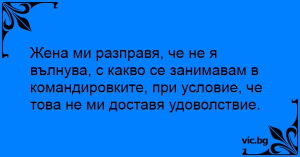 Жена ми разправя, че не я вълнува, с какво се занимавам в командировките, при условие, че това не ми доставя удоволствие.