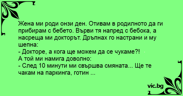 Жена ми роди онзи ден. Отивам в родилното да ги прибирам с бебето. Върви тя напред с бебока, а насреща ми докторът. Дръпнах го настрани и му шепна: