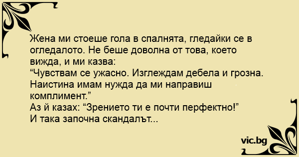 Жена ми стоеше гола в спалнята, гледайки се в огледалото. Не беше доволна от това, което вижда, и ми казва:
