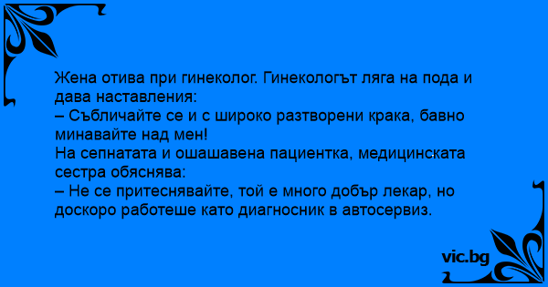 Жена отива при гинеколог. Гинекологът ляга на пода и дава наставления: