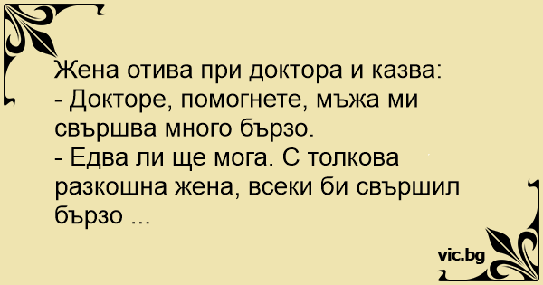 - Докторе, помогнете, мъжа ми свършва много бързо.