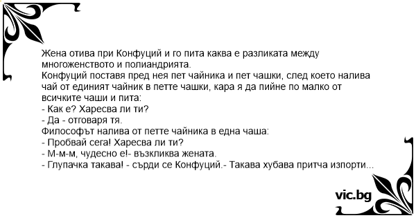 Жена отива при Конфуций и го пита каква е разликата между многоженството и полиандрията.