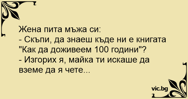 - Скъпи, да знаеш къде ни е книгата "Как да доживеем 100 години"?