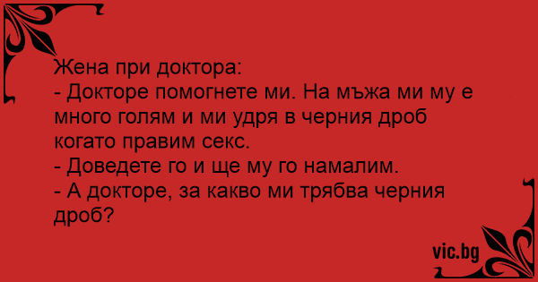 - Докторе помогнете ми. На мъжа ми му е много голям и ми удря в черния дроб когато правим cekc.