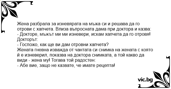 Жената гневна изважда от чантата си снимка на жената с която й е изневерил, показва на доктора снимката, а той какво да види - жена му! Тогава той радостен: