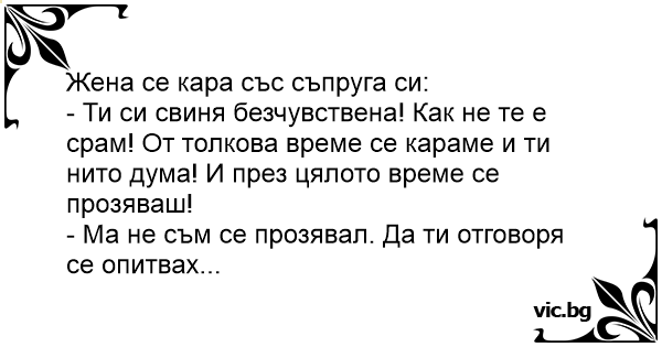 - Ти си свиня безчувствена! Как не те е срам! От толкова време се караме и ти нито дума! И през цялото време се прозяваш!