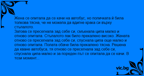 Затова се пресегнала зад себе си, смъкнала ципа малко и отново опитала. Стъпалото пак било прекалено високо. Жената отново се пресегнала зад себе си, спуснала ципа още малко и отново опитала. Полата обаче била прекалено тясна. Решена да хване автобуса, тя отново се пресегнала зад себе си, спуснала ципа малко и за пореден път се опитала да се качи. В този момент неочаквано усетила, че две ръце я хващат за задника и я повдигат. Тя гневно се обърнала и погледнала мъжа зад себе си: