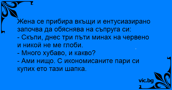 Жена се прибира вкъщи и ентусиазирано започва да обяснява на съпруга си: