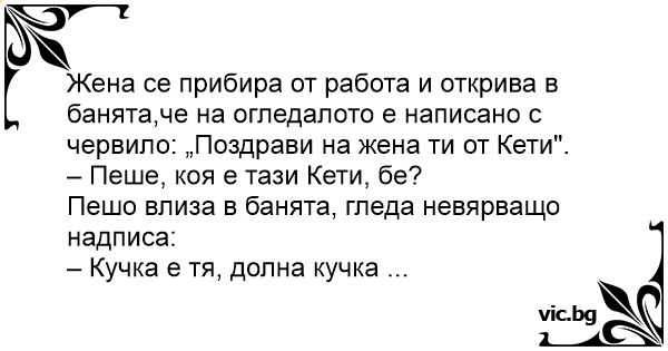 Жена се прибира от работа и открива в банята,че на огледалото е написано с червило: „Поздрави на жена ти от Кети".