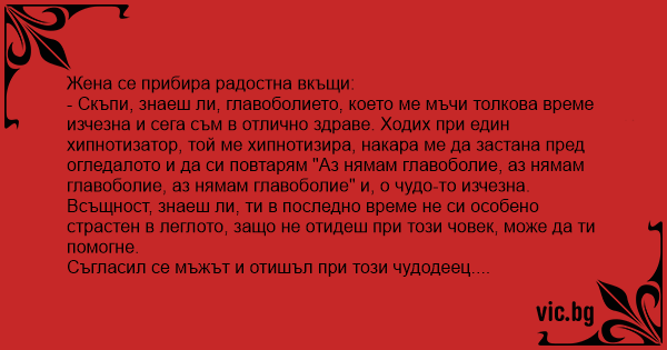 - Скъпи, знаеш ли, главоболието, което ме мъчи толкова време изчезна и сега съм в отлично здраве. Ходих при един хипнотизатор, той ме хипнотизира, накара ме да застана пред огледалото и да си повтарям "Аз нямам главоболие, аз нямам главоболие, аз нямам главоболие" и, о чудо-то изчезна. Всъщност, знаеш ли, ти в последно време не си особено страстен в леглото, защо не отидеш при този човек, може да ти помогне.
