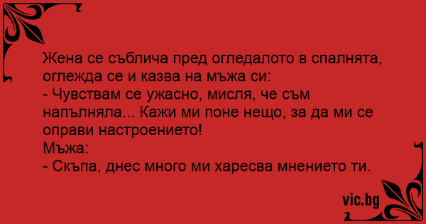 - Чувствам се ужасно, мисля, че съм напълняла... Кажи ми поне нещо, за да ми се оправи настроението!