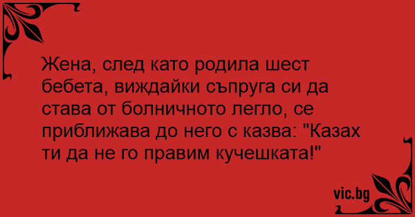 Жена, след като родила шест бебета, виждайки съпруга си да става от болничното легло, се приближава до него с казва: "Казах ти да не го правим кучешката!"