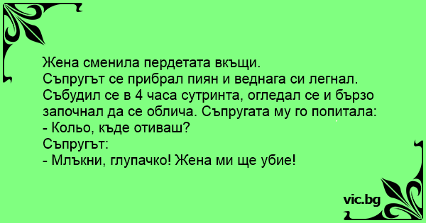 Съпругът се прибрал пиян и веднага си легнал. Събудил се в 4 часа сутринта, огледал се и бързо започнал да се облича. Съпругата му го попитала: