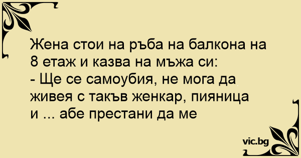 Жена стои на ръба на балкона на 8 етаж и казва на мъжа си: