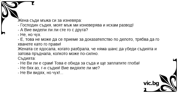 - Господин съдия, моят мъж ми изневерява и искам развод!