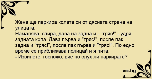 - Извинете, госпожо, вие по слух ли паркирате?