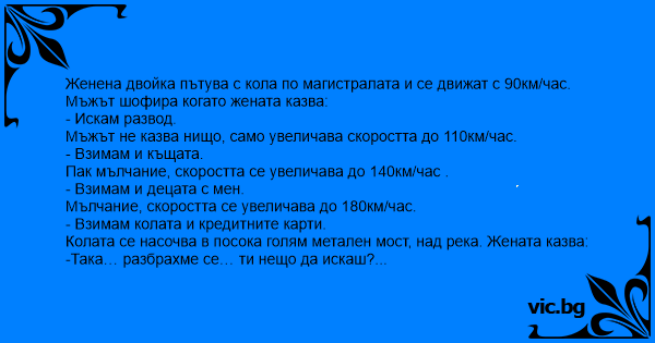 Женена двойка пътува с кола по магистралата и се движат с 90км/час. Мъжът шофира когато жената казва: