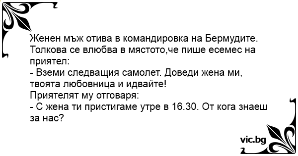 Женен мъж отива в командировка на Бермудите. Толкова се влюбва в мястото,че пише есемес на приятел: