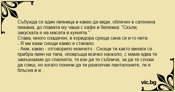 Събужда се един пияница и какво да види, облечен в сатенена пижама, до главата му чаша с кафе и бележка: "Скъпи, закуската е на масата в кухнята."