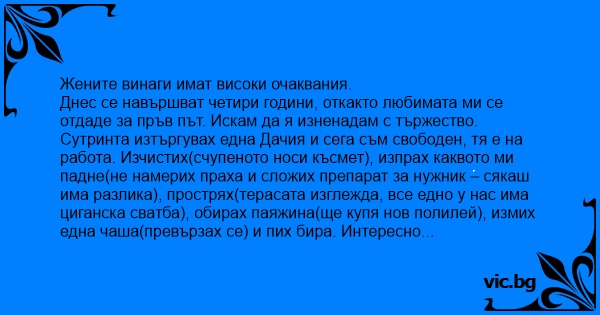 Днес се навършват четири години, откакто любимата ми се отдаде за пръв път. Искам да я изненадам с тържество. Сутринта изтъргувах една Дачия и сега съм свободен, тя е на работа. Изчистих(счупеното носи късмет), изпрах каквото ми падне(не намерих праха и сложих препарат за нужник – сякаш има разлика), прострях(терасата изглежда, все едно у нас има циганска сватба), обирах паяжина(ще купя нов полилей), измих една чаша(превързах се) и пих бира. Интересно защо, когато леем плоча в къщата на някой приятел или поправям колата, се измъквам без драскотина, а реша ли да помогна в домакинството съм целият в рани. Оправих леглото, но без да разбера, съм заспал връз него. Следобед продължавам. Ще готвя палачинки за вечеря. Поради горчивия ми опит с баницата(ползваме я за дъска да си режем мезета) съм много предпазлив. Осъзнах, че ако си правя салата за ракията, никога няма да се порежа, но тръгна ли да кълцам зеленчуци за нещо друго, кръвта ми ще се лее по плота. Котката Ивелина вижда, че влизам в кухнята и моментално спринтира в най-далечния край на апартамента. В бързината се пребива в някои от мебелите, но макар и натъртена, успешно излиза в нелегалност. Всичко е толкова чисто. Грижливо подреждам продуктите и сечивата. Не мога да ползвам миксера, защото е скрит. Отварям лаптопа на работната маса. Чета рецепти. Струва ми се, че дори произволно избран бобър, ще се справи с палачинките – толкова е лесно. Сипвам нужното количество брашно в голямата купа. Помирисах го да не е развалено... и тогава... кихнах. Целият съм бял, а в края на очите ми се образува тесто. Измивам се. Още брашно. Вода. Прясното мляко пада на бучки, но сигурно такъв му е моделът(някакво здравословно може би). Яйцата чупя на мивката и в шепа пренасям до масата – пода не се цапа много. Има и черупки, но те са полезни при болка от обувки и други болести. Разбърквам. Слагам олиото да се загрее. Пуша, ходя насам-натам, сипвам си една малка... чудя се дали е готово. Това се проверява, като му ливнеш малко вода отгоре... Майкоо... Гейзер – всичко фъщи, а моя милост крещи. В огледалото лицето ми изглежда сварено. Не се отказвам. Първата ми палачинка прилича на голям хляб. Втората е по-добре. Сега ще я обърна във въздуха като кулинарите. Оооопп... метнах и тигана. Същия издрънча в тавана и право върху лаптопа, гледам как последния се пържи. Трудно се предавам – олио, подгряване, гейзер, нова смес, подхвърляне... сега пък я няма. Оглеждам се наляво-надясно, палачинката изчезнала. Проверявам горе... да залепнала е на тавана. Същият вече съвсем на нищо не прилича. Забърквам гипс и майсторски го измазвам. Четвърти последен опит – Бог ми е свидетел – от тук палачинка ще излезе. Много бавно става... и тоя тиган що натежа така... след малко разбрах – объркал съм съдовете и сега пека гипсовата смес – сготвил съм плочка. Ключалката превъртя. Тухлите на вината ме затрупаха. Годеницата ми стоеше пред кухнята, а Ивелина я гледаше като майка спасител. Стълба, разсипано олио, черупки, кално брашно, пържен лаптоп, посуда, бинтове и катастрофа. Нора се промъкна през отломките. Целуна ме с божествените си устни(даже малко език ми пусна) и рече: „Не се безпокой, Кольо, знам, че си искал да ме изненадаш. Отиди да погледаш мач на телевизора, бира ще ти донеса, а аз ще оправя тук. Почини си, нали помниш, че утре идват шефовете ми от Германия и сме канени на в