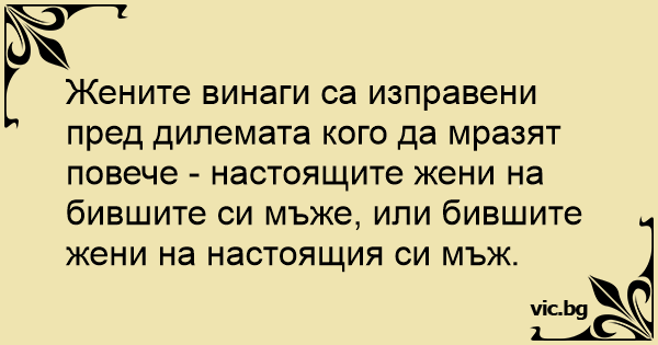 Жените винаги са изправени пред дилемата кого да мразят повече - настоящите жени на бившите си мъже, или бившите жени на настоящия си мъж.