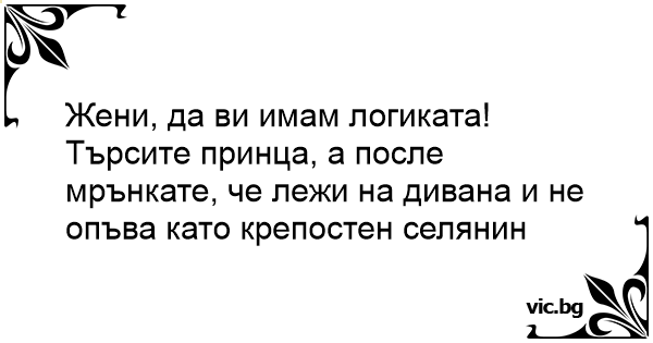 Жени, да ви имам логиката!Търсите принца, а после мрънкате, че лежи на дивана и не опъва като крепостен селянин