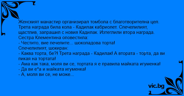 Женският манастир организирал томбола с благотворителна цел. Трета награда била кола - Кадилак кабриолет. Спечелилият, щастлив, запрашил с новия Кадилак. Изтеглили втора награда.