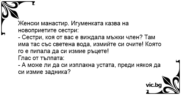 - Сестри, коя от вас е виждала мъжки члeн? Там има тас със светена вода, измийте си очите! Която го е пипала да си измие ръцете!