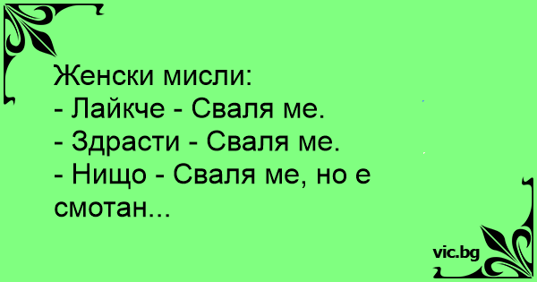 Женски мисли:<br />- Лайкче - Сваля ме.<br />- Здрасти - Сваля ме.<br />- Нищо - Сваля ме, но е смотан...