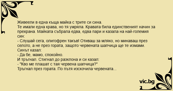 - Слушай сега, олигофрен такъв! Отиваш за мляко, но минаваш през селото, а не през гората, защото червената шапчица ще те измами.