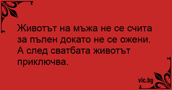 Животът на мъжа не се счита за пълен докато не се ожени. English Deutsch Español Русский Français Italiano Ελληνικά Македонски Türkçe Українська Português Polski Svenska Nederlands Dansk Norsk Suomi Magyar Româna Čeština Lietuvių Latviešu Hrvatski