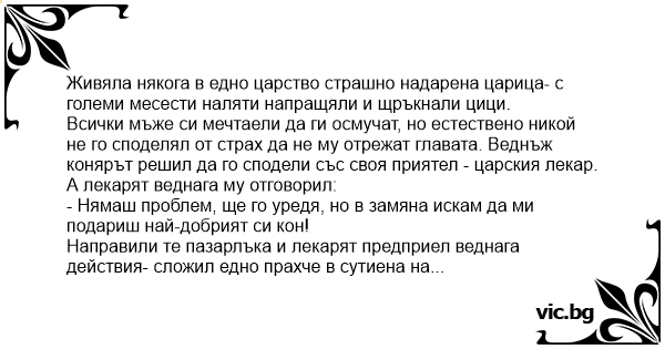Направили те пазарлъка и лекарят предприел веднага действия- сложил едно прахче в сутиена на царицата, и тя като го сложила,след малко я обзел силен сърбеж. Извикала лекаря, той се направил че я преглежда, и важно заключил: