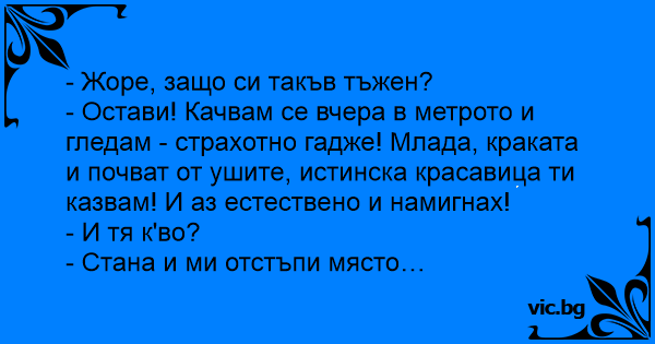 - Остави! Качвам се вчера в метрото и гледам - страхотно гадже! Млада, краката и почват от ушите, истинска красавица ти казвам! И аз естествено и намигнах!