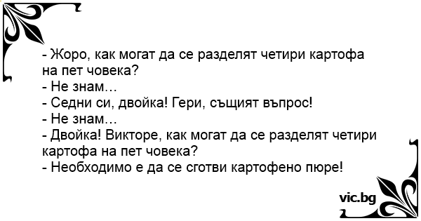 - Двойка! Викторе, как могат да се разделят четири картофа на пет човека?