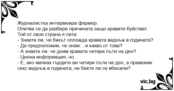 Eine Reporterin fragt einen Bauer: "Was glauben Sie, ist die Ursache für den Rinderwahnsinn?" Bauer: "Naja, wie oft glauben Sie, wird die Kuh vom Bullen gerammelt." Reporterin: "Naja, höchstens einmal im Jahr, denk ich." Bauer: "Und wie oft wird die Kuh gemolken?" Reporterin: "Naja, vielleicht...