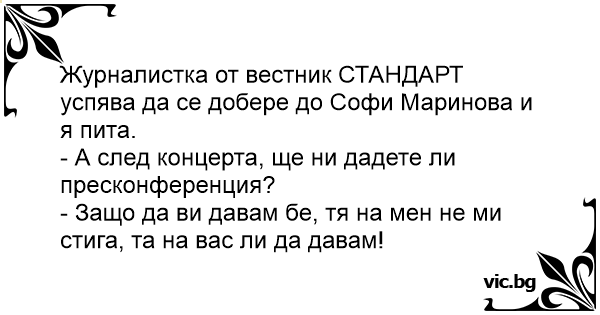 Журналистка от вестник СТАНДАРТ успява да се добере до Софи Маринова и я пита.