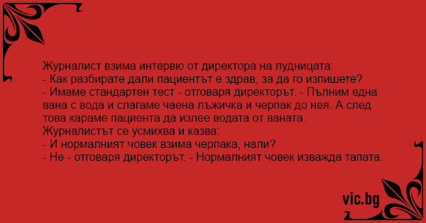 - Имаме стандартен тест - отговаря директорът. - Пълним една вана с вода и слагаме чаена лъжичка и черпак до нея. А след това караме пациента да излее водата от ваната.
