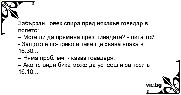 Idzie turysta drogą spotyka Bacę i pyta się: - Baco, mogę przejść przez waszą łąkę bo chcę zdążyć na pociąg o 10:40. - A idźcie, a jak spotkacie mojego byka to i na ten o 9:15 zdążycie...