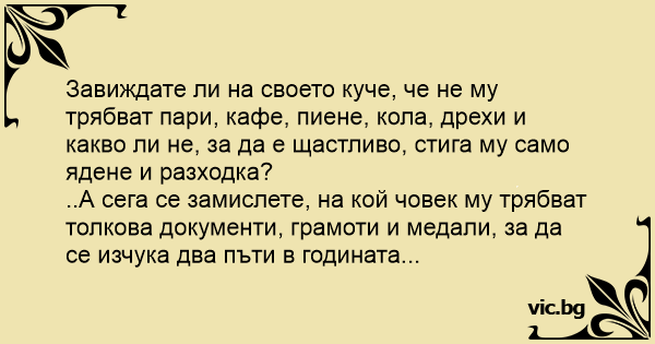 Завиждате ли на своето куче, че не му трябват пари, кафе, пиене, кола, дрехи и какво ли не, за да е щастливо, стига му само ядене и разходка?