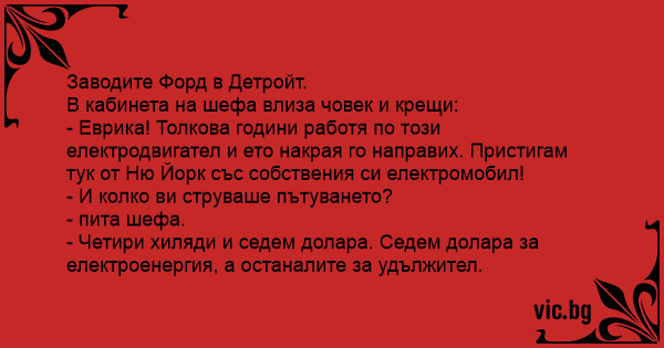 - Еврика! Толкова години работя по този електродвигател и ето накрая го направих. Пристигам тук от Ню Йорк със собствения си електромобил!