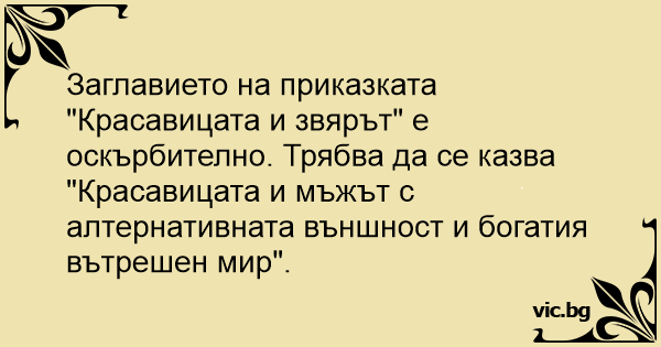 Заглавието на приказката "Красавицата и звярът" е оскърбително. Трябва да се казва "Красавицата и мъжът с алтернативната външност и богатия вътрешен мир".
