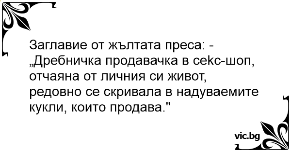 Заглавие от жълтата преса: - „Дребничка продавачка в cekc-шоп, отчаяна от личния си живот, редовно се скривала в надуваемите кукли, които продава."