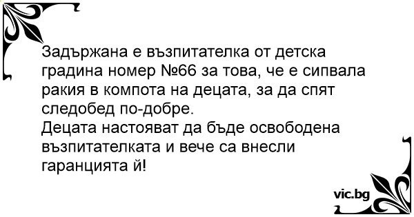 Задържана е възпитателка от детска градина номер №66 за това, че е сипвала ракия в компота на децата, за да спят следобед по-добре.