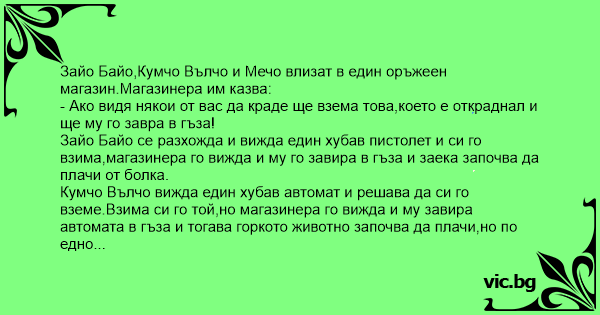 Зайо Байо,Кумчо Вълчо и Мечо влизат в един оръжеен магазин.Магазинера им казва: