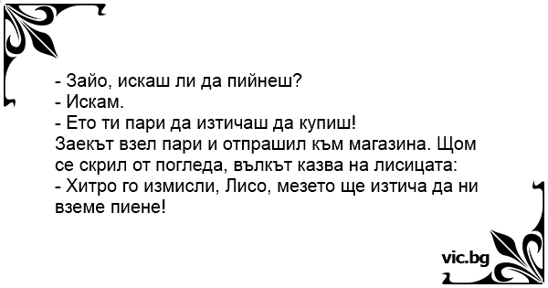Заекът взел пари и отпрашил към магазина. Щом се скрил от погледа, вълкът казва на лисицата: