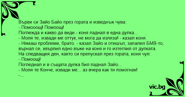 - Нямаш проблеми, брато. - казал Зайо и отишъл, запалил БМВ-то, върнал се, хвърлил едно въже на коня и го изтеглил от дупката.
