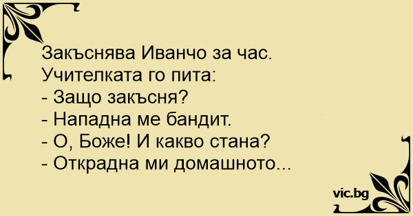 Закъснява Иванчо за първия час. Учителкта го пита: