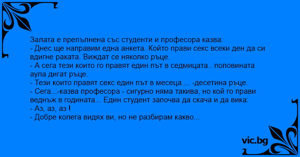 - Днес ще направим една анкета. Който прави cekc всеки ден да си вдигне раката. Виждат се няколко ръце.